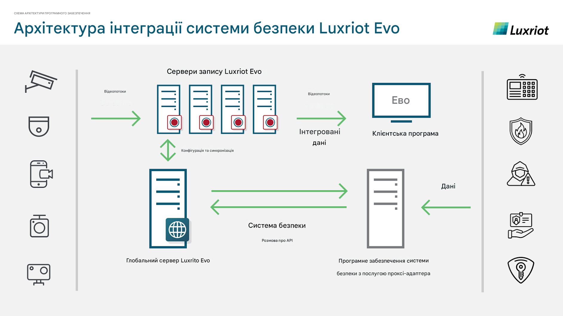 Сумісність: API Luxriot Evo підтримує інтеграцію з різноманітними системами та пристроями, забезпечуючи гнучкість у виборі обладнання.